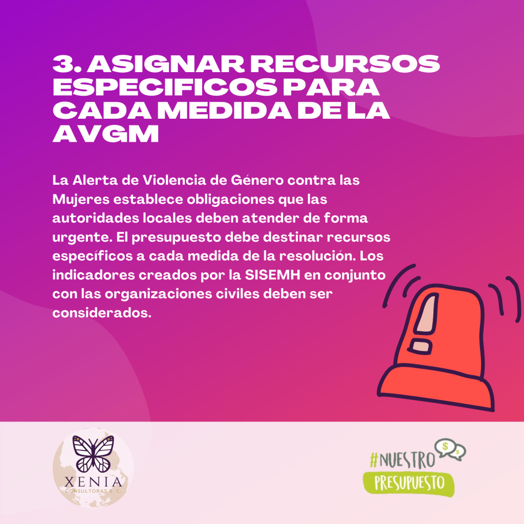 3. Asignar recursos específicos para cada medida de la Alerta de violencia de género contra las mujeres. La Alerta de Violencia de Género contra las Mujeres establece obligaciones que las autoridades locales deben atender de forma urgente. El presupuesto debe destinar recursos específicos a cada medida de la resolución. Los indicadores creados por la SISEMH en conjunto con las organizaciones civiles deben ser considerados.